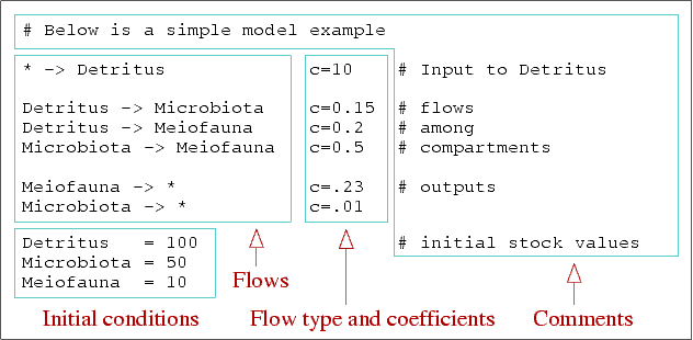 - Flows among compartments: A directional flow from compartment A to compartment B is intuitively represented by "A -> B". Environment is represented by "*", so "* -> C" and "D -> *" represent the environmental input to compartment C and the dissipation from compartment D respectively.